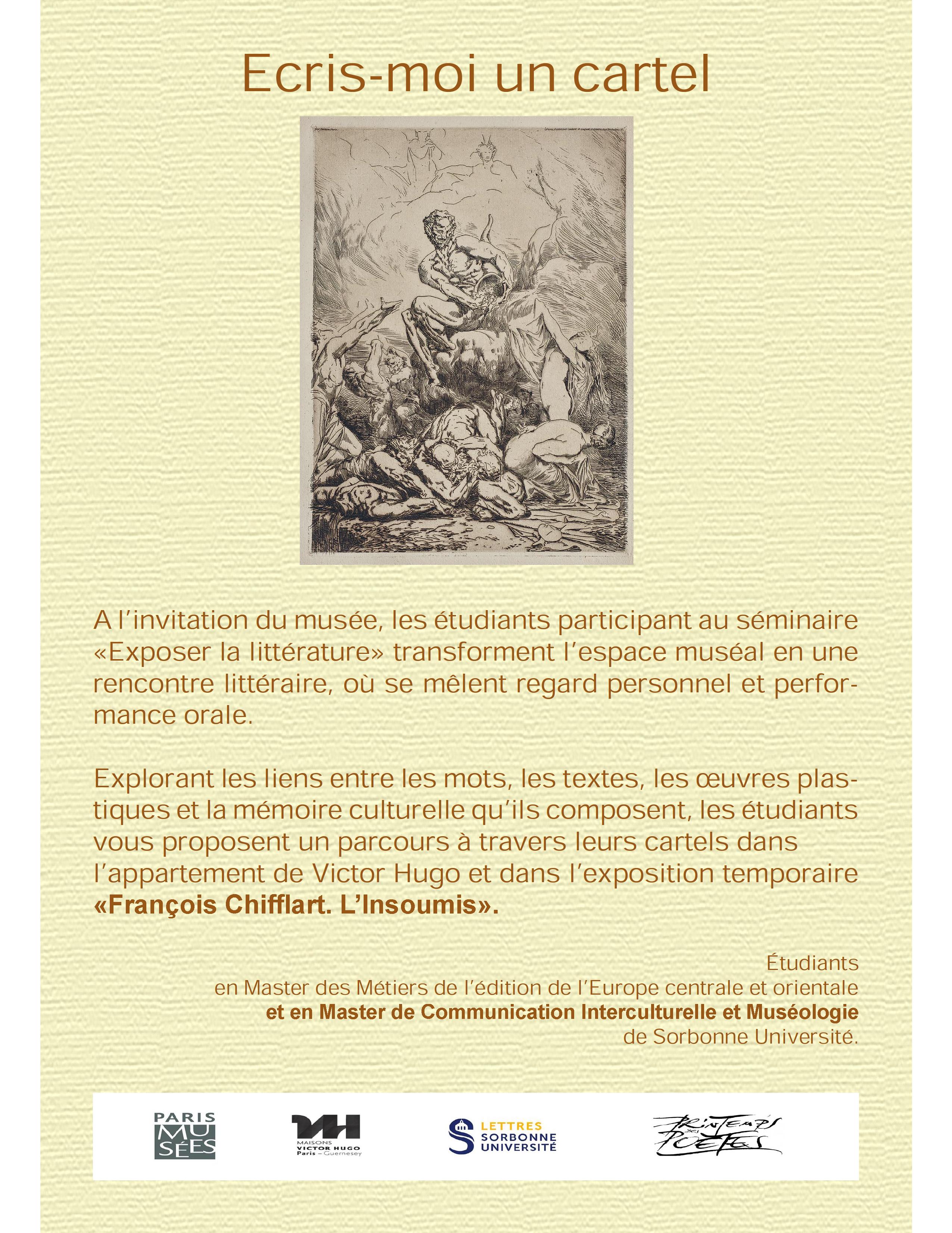 Explorant les liens entre les mots, les textes, les œuvres plastiques et la mémoire culturelle qu’ils composent, les étudiants vous proposent un parcours à travers leurs cartels dans l’appartement de Victor Hugo et dans l’exposition temporaire «François Chifflart. L’Insoumis».