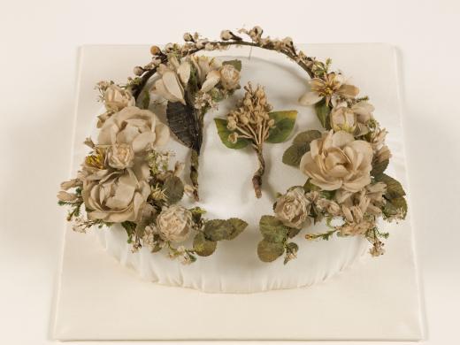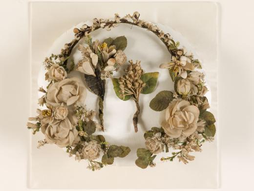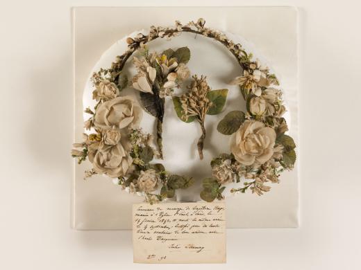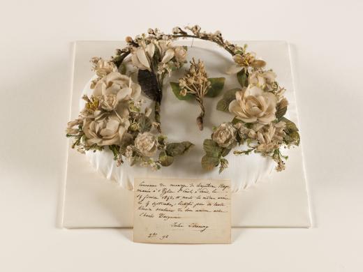 - Marques et inscriptions : Couronne de mariage de Léopoldine Hugo, mariée à l'Eglise Saint Paul, à Paris, le 14 février 1843 et morte la même année le 4 septembre. Certifié par sa tante témoin oculaire de son union avec Charles Vacquerie / Julie Chenay / 8bre 92