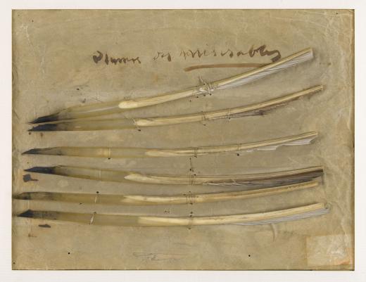 - Marques et inscriptions : Sur le carton de fond, de la main de Victor Hugo : "plumes des Misérables"