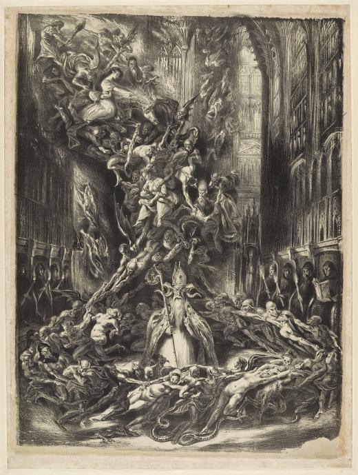 La composition de Boulanger est emblématique de l’inspiration frénétique – selon le terme de Charles Nodier – du romantisme noir avec ce maelström de démons et de sorcières s’envolant vers les voûtes d’une église.
