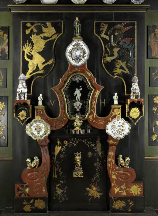 Comme il aime à le faire, Hugo y a incrusté des plats de Delft, ménagé des supports pour les céramiques et orné le tout d’un décor gravé et peint. Il coiffe l’ensemble de deux panneaux d’animaux fabuleux, dont le motif du dragon, à droite, est repris d’un meuble de laque se trouvant dans le salon de billard d’Hauteville House.