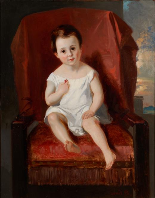 Peint en 1831 ou 1832, ce portrait d’Adèle, dernière-née des enfants de Victor Hugo, fait pendant au portrait de sa sœur dit Léopoldine à l’âge de quatre ans. Le plus intime des peintres liés à Hugo, Louis Boulanger, révèle ici ses talents de portraitiste. Il dialogue avec les peintures vénitienne et flamande, d’une harmonie de couleurs maîtrisée, d’une brosse énergique, il livre le portrait d’une très jeune enfant dépourvu de toute mièvrerie et l’un des grands portraits du romantisme.