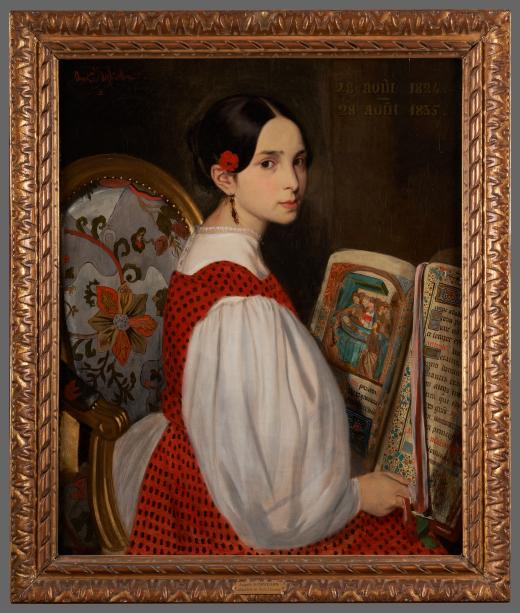 Ce portrait a été réalisé pour l’anniversaire des onze ans de Léopoldine. Le livre d’Heures semble rappeler que la jeune fille commence à aller au catéchisme, préparant sa communion qui aura lieu l’année suivante. Comme le « Portrait de Victor Hugo avec son fils (François-)Victor » du même Auguste de Châtillon, que l’on date de 1836, cette peinture nous livre sans doute une information sur l’ameublement de l’appartement de la place Royale avec ce fauteuil qui meublait peut-être le grand salon.