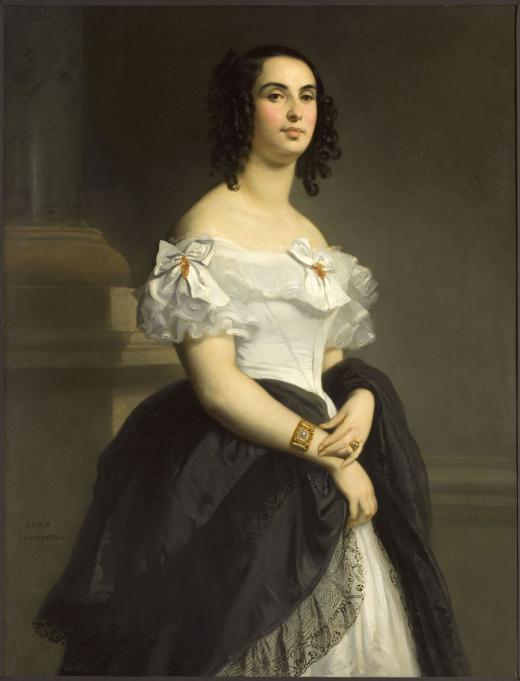 Peignant avec soin l’épouse en grande tenue, épaules nues, dans un décor de colonnes sévères, Boulanger réalise un portrait d’apparat qui témoigne du statut social du couple et de son ambition. Maîtresse d’une maison où elle reçoit le tout-Paris ainsi que le duc et la duchesse d’Orléans, Mme Hugo va jouer un rôle important dans l’élection de son mari à l’Académie française, en 1841.