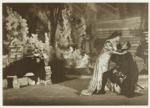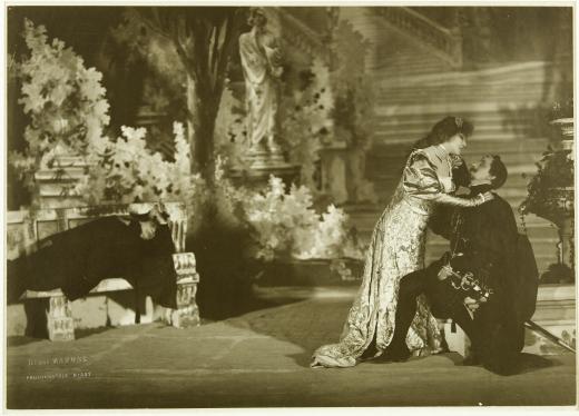 Sarah Bernhardt dans le rôle de la Tisbe, Deneubourg en Rodolfo et De Max en Homodéi, journée I, scène 2